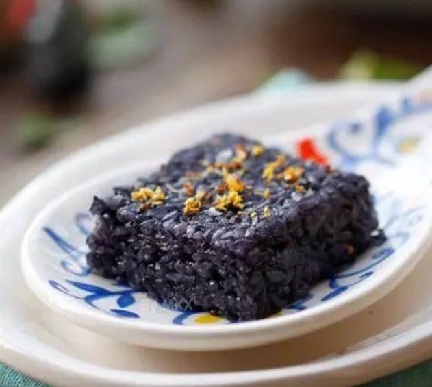 用乌饭树的叶汁浸泡糯米后蒸煮而成,色泽蓝绿乌黑,口感香软