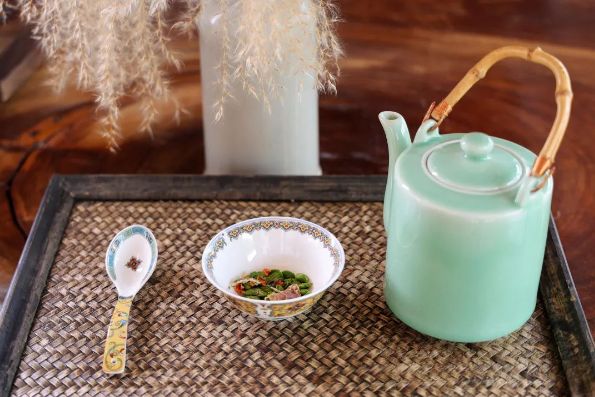 图源:诗画德清 第二道是咸茶,咸茶又名烘豆茶,是德清被列入国家级非物质文化遗产的特色茶,是款待上宾的最高礼节。制作烘豆茶主要用枳子、野芝麻、笋干、青豆等几种料组成,其主料是青豆,先将黄豆剥开,再将剥好的黄豆用水煮熟,最后把煮熟的黄豆放在非常宽大的圆形竹匾里晾干,接下来就是烘烤,在这过程中还要时刻注意控制火候、翻烤青豆,才能保证烘豆又香又绿。