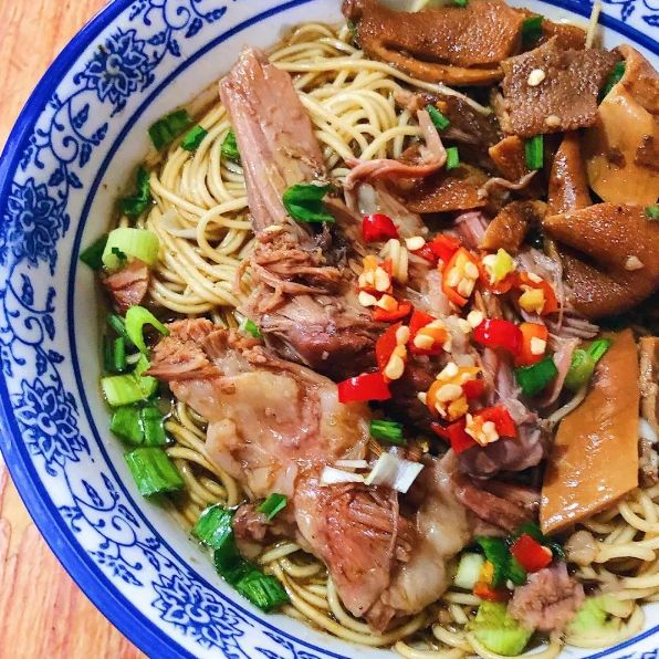 鸭绞面的鸭腿、鸭肉、鸭胗,都有横竖一道道的绑痕,鸭绞面里的“绞”,不是鸭的“脚”,正是得名于那一道道绑痕。这绑痕需要先将鸭肉用棉线扎起来,再放入锅中炖煮。这便是“鸭绞面”名字的由来。鸭肉经过几个小时的熬煮后,酥而不烂,形状完整,香气四溢。