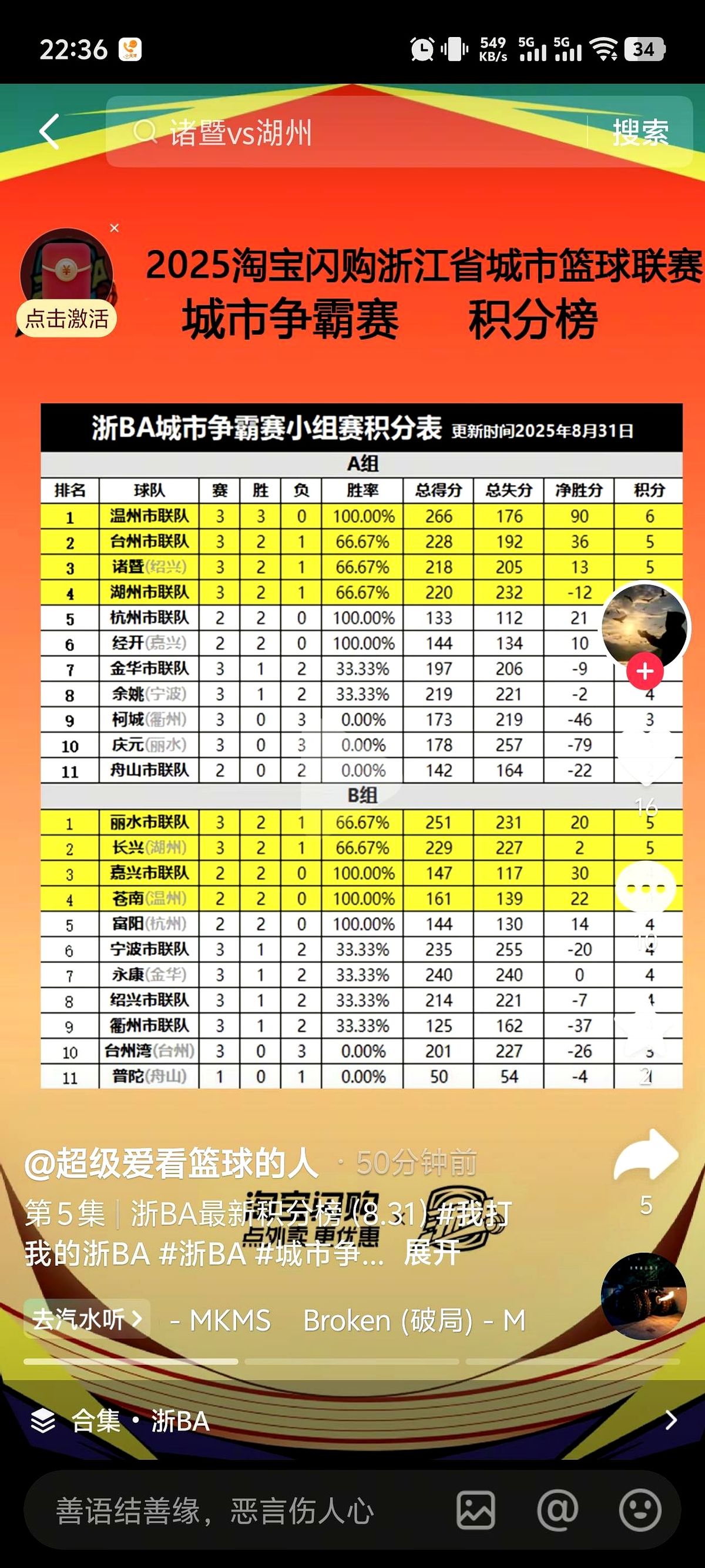 查去年浙BA数据,同分先看相互净胜分,金华-4、台州-6、湖州-2,湖州稍占便宜,可他们下一场对手正是势头最猛的杭州。